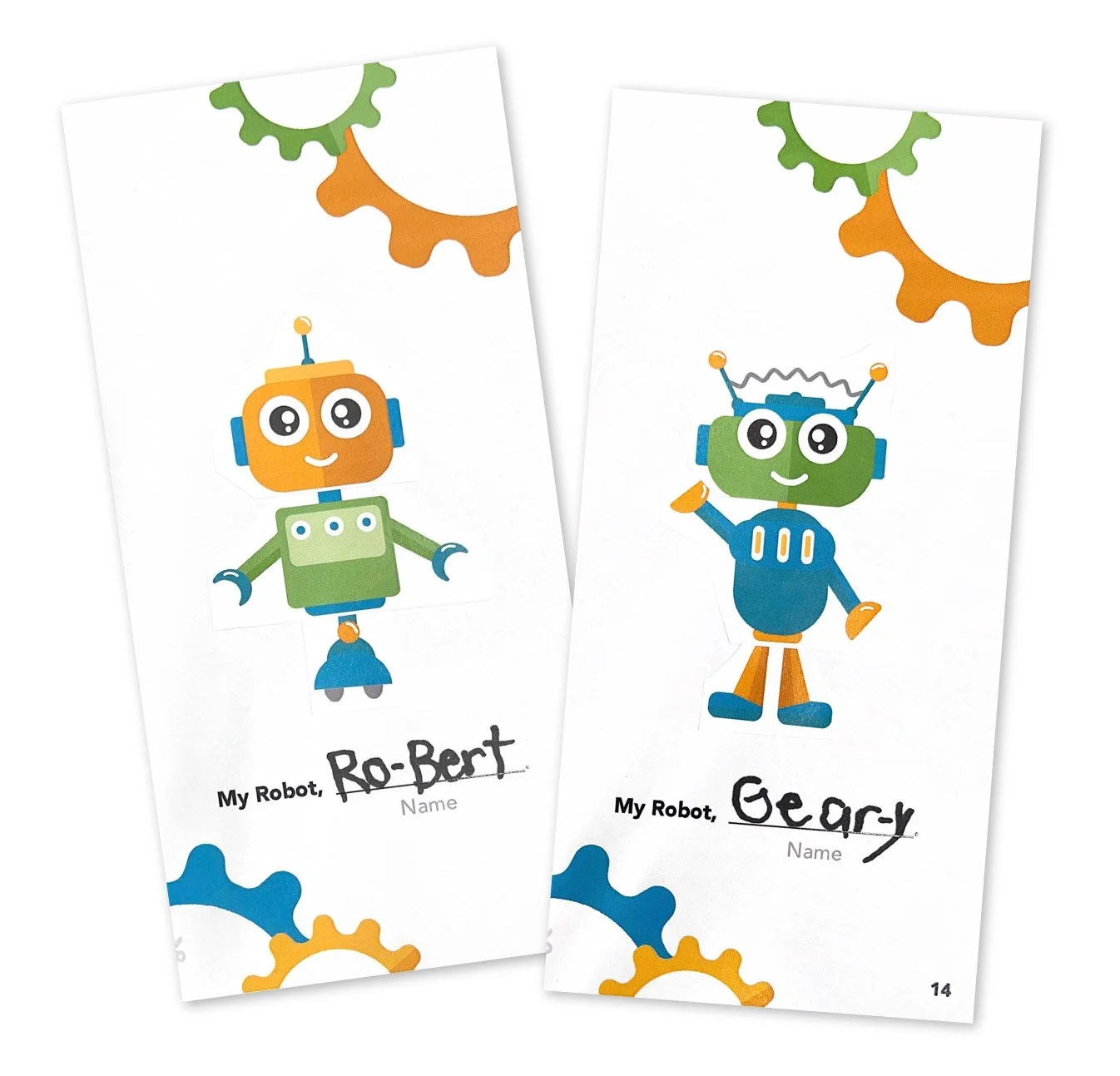 The robot, Axle, acts as a guide who learns and grows alongside the reader. Kids place stickers within the gears to track their literacy accomplishments and visualize their progress.